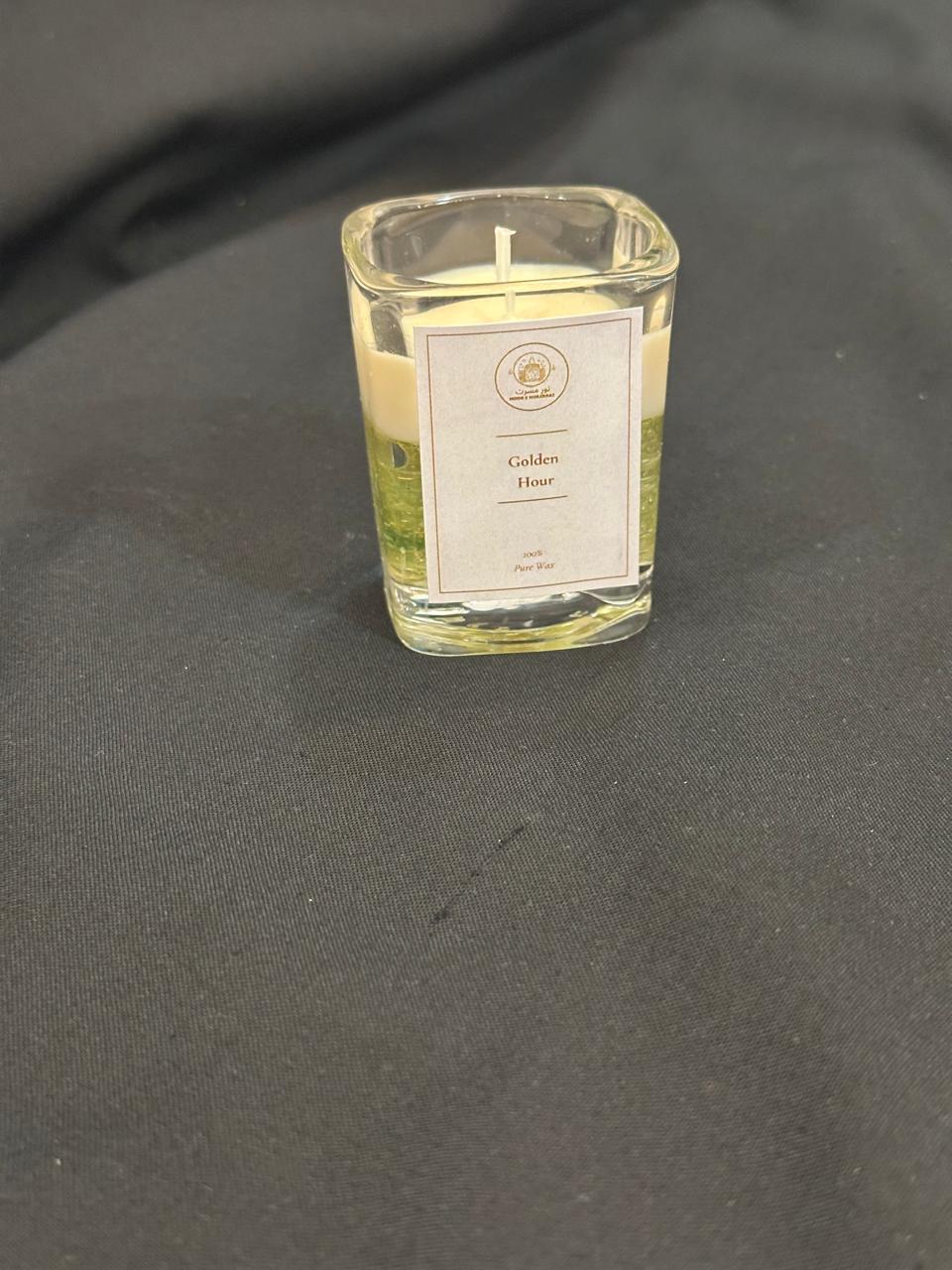 Inspired by the most beautiful time of day, the Golden Hour Shot Candle is a masterpiece of light and texture. This specialty candle showcases a stunning two-tone effect, with a shimmering golden-green gel-like base topped with our signature smooth ivory wax. Housed in a heavy-base square glass that reflects light from every angle, it is designed to glow brilliantly while filling your space with a rich, immersive scent. Whether you’re looking for a sophisticated wedding favor, a luxury addition to a gift hamper, or a small treat to brighten your own desk, this 100% pure wax candle embodies the elegance and cheerful spirit of the Noor E Musarrat collection.